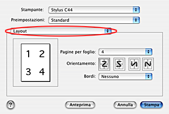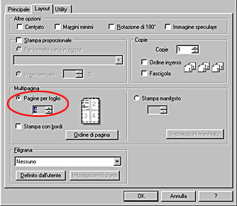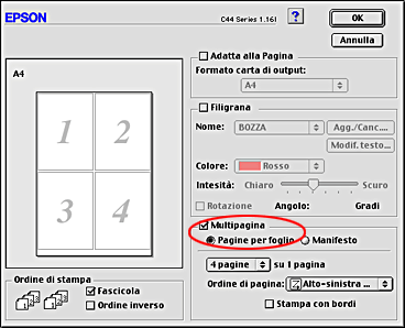 Pagine per foglio permette di stampare due o quattro pagine su fogli singoli.