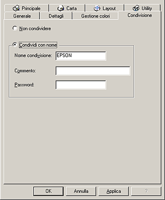 Selezionare Condividi con nome, digitare le informazioni sulla stampante in base alle proprie esigenze, quindi fare clic su OK.