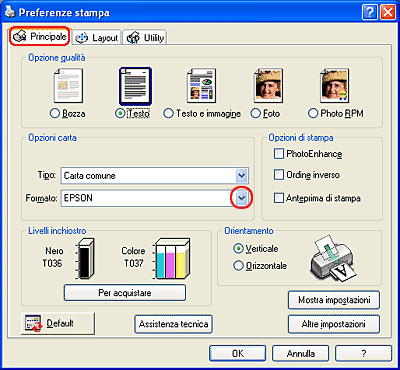 Fare clic su Salva, quindi su OK per tornare al menu Principale. Il nome del nuovo formato carta personalizzato viene visualizzato come impostazione di Formato.