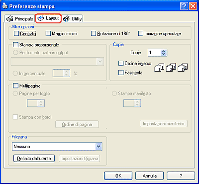Selezionare questa casella di controllo per rendere disponibili le impostazioni Pagine per foglio e Stampa manifesto.
