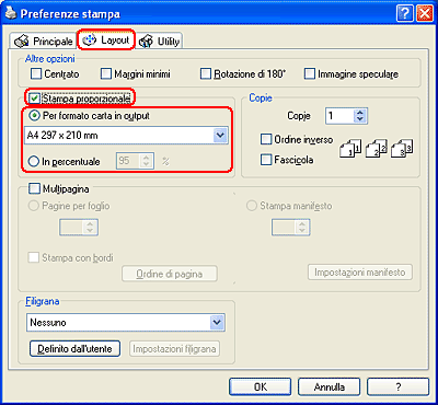 Fare clic sulla scheda Layout, quindi selezionare la casella di controllo Stampa proporzionale. Per modificare le dimensioni del documento, è possibile selezionare le impostazioni che seguono.