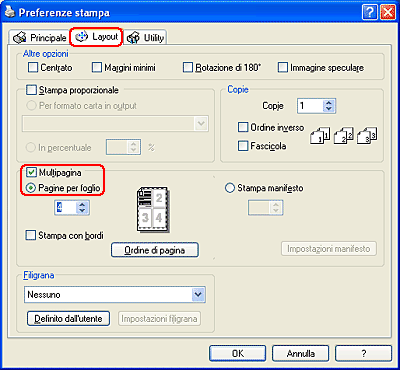 ![]() | Per la stampa di più pagine per foglio, effettuare le impostazioni che seguono. |