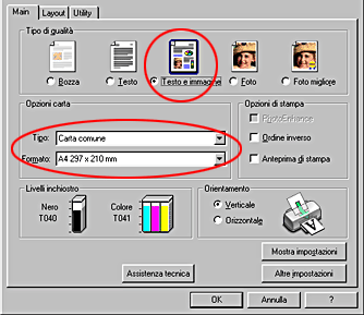 ![]() | Fare clic sulla scheda Principale, quindi selezionare Carta comune e A4 come impostazione di Opzioni carta e Testo e immagine come impostazione di Tipo di qualità. |