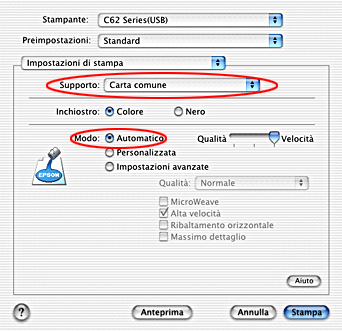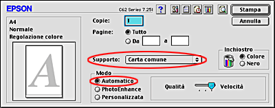 Selezionare Carta comune come impostazione di Supporto e Automatico come impostazione di Modo.