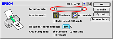 Selezionare A4 come impostazione di Formato carta. Quindi, fare clic su OK per chiudere la finestra di dialogo.