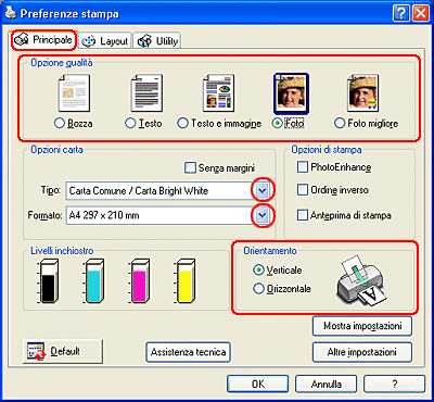 Fare clic sulla scheda Principale, quindi effettuare l'impostazione di Opzioni qualità. Per informazioni dettagliate sulle impostazioni di Opzioni qualità, vedere la sezione che segue.