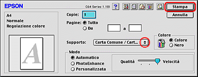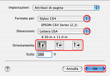 Effettuare l'impostazione appropriata di Formato per. Quando si stampa con i margini standard, selezionare Stylus C64.