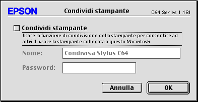 Utilizzare l'impostazione di condivisione stampante, presente come funzione standard in Mac OS X 10.2 o versione successiva. Questa funzione non risulta disponibile con Mac OS X 10.1.