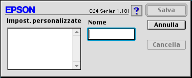 Digitare un nome univoco per le impostazioni nella casella di testo Nome, quindi fare clic su Salva. Il nome può contenere fino a 16 lettere e numeri. È anche possibile utilizzare fino ad otto caratteri a doppio byte; tuttavia, questi potrebbero non essere visualizzati correttamente sullo schermo a seconda delle impostazioni del sistema operativo. Le impostazioni personalizzate verranno aggiunte all'elenco Impostazioni personalizzate e verrà selezionata l'ultima impostazione personalizzata. È possibile salvare fino a 100 impostazioni personalizzate.