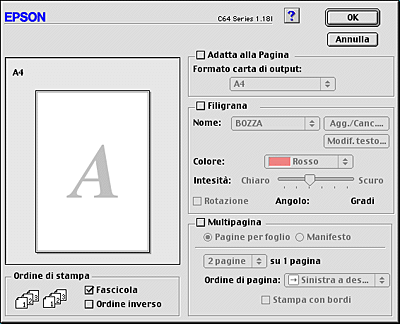 Consente di scegliere tra Pagine per foglio e Manifesto. Pagine per foglio