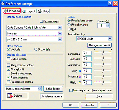 EPSON Vivace: In base ai dati, aumenta il bilanciamento del colore per ottenere risultati di stampa ottimali. Questa impostazione è consigliata per la gran parte dei lavori di stampa. Grafici e diagrammi: Intensifica i colori e riduce i mezzi toni mettendo in risalto l'immagine. Utilizzare questa impostazione per i grafici e i diagrammi. |