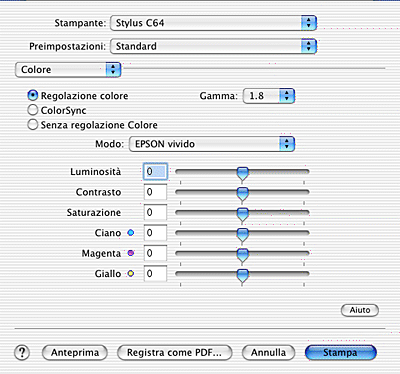 Selezionare Colore dal menu a comparsa per controllare i metodi di regolazione e di corrispondenza del colore forniti con il driver della stampante. Usare queste impostazioni per sperimentare nuove idee di stampa oppure per mettere a punto una serie di impostazioni di stampa adatte alle proprie esigenze specifiche. Una volta soddisfatti delle nuove impostazioni, è possibile aggiungerle all'elenco Impostazioni personalizzate nella finestra di dialogo Stampa.