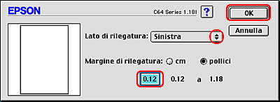 Scegliere cm o pollici come impostazione dell'Unità. Quindi, specificare la larghezza del margine di rilegatura. È possibile specificare qualsiasi larghezza compresa tra 3 mm e 30 mm, oppure tra 0,12 pollici e 1,18 pollici.