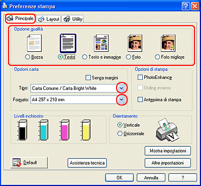 Fare clic sulla scheda Principale, quindi eseguire l'impostazione Opzione qualità. Per informazioni dettagliate sulle impostazioni di Opzione qualità, vedere la sezione che segue.