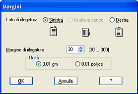 Se è selezionato Verticale come impostazione dell'Orientamento nel menu Principale, sono disponibili le posizioni di rilegatura Sinistra o Destra. La posizione di rilegatura Superiore disponibile solo se come impostazione dell'orientamento è selezionato Orizzontale.