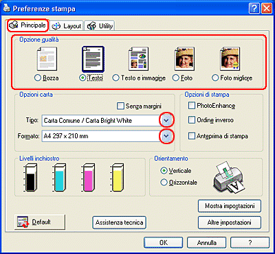 Fare clic sulla scheda Principale, quindi eseguire l'impostazione Opzione qualità. Per informazioni dettagliate sulle impostazioni di Opzione qualità, vedere la sezione che segue. Vedere Opzioni qualità