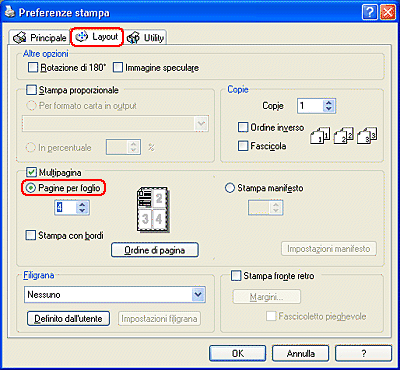 ![]() | Nella finestra di dialogo Layout, selezionare la casella di controllo denominata Multipagina, quindi selezionare Pagine per foglio. |