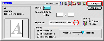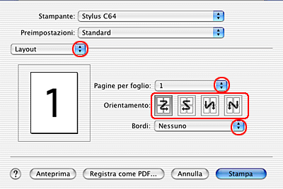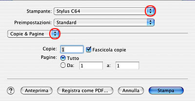 ![]() | Selezionare Stylus C64 come impostazione di Stampante, quindi effettuare le impostazioni di Copie & Pagine. |