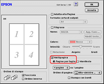 La stampa di pagine multiple su foglio singolo consente di stampare due o quattro pagine su fogli singoli.