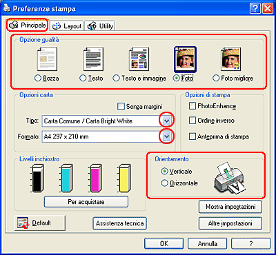 Fare clic sulla scheda Principale, quindi eseguire l'impostazione di Opzioni qualità. Per informazioni dettagliate sulle impostazioni di Opzioni qualità, vedere la sezione che segue.