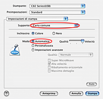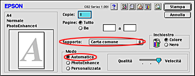 Selezionare Carta comune come impostazione di Supporto e Automatico come impostazione di Modo.
