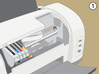 Premere il tasto di controllo inchiostro . La stampante sposterà la testina di stampa e inizierà a caricare il sistema di distribuzione dell'inchiostro. Questo processo richiede circa un minuto per essere completato. Quando il processo di caricamento dell'inchiostro è ultimato, la testina di stampa torna nella posizione di riposo. La spia di alimentazione smetterà di lampeggiare e rimarrà accesa e la spia di inchiostro esaurito si spegnerà.