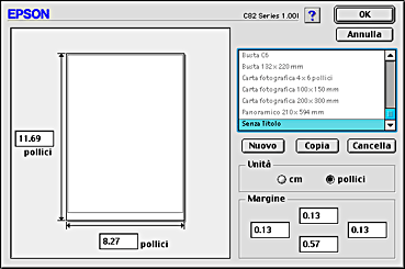È possibile definire fino a 100 formati carta. I nomi dei formati carta creati appariranno nell'elenco Formato carta della finestra di dialogo Formato di Stampa.