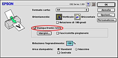 La EPSON Stylus C82 Series supporta la stampa fronte-retro. Sono disponibili due tipi di stampa fronte-retro. La stampa fronte-retro standard consente di stampare prima le pagine dispari. Una volta stampate, tali pagine possono essere nuovamente caricate per stampare le pagine pari sul lato opposto del foglio. La stampa fronte-retro sotto forma di fascicoletto pieghevole consente di ottenere dei fascicoletti con singola piegatura. Fare riferimento alla sezione appropriata riportata di seguito.