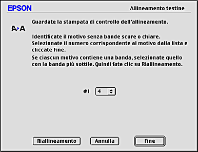 L'utility Allineamento testine può essere utilizzata per migliorare la qualità di stampa dei propri documenti. L'allineamento della testina di stampa dovrà essere regolato se nei documenti stampati dovessero apparire delle righe verticali non allineate o delle bande bianche o nere oppure scure o chiare. Seguire le istruzioni visualizzate sullo schermo per usare questa utility.