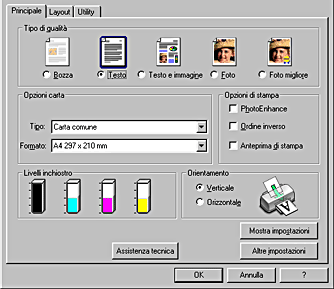Nel menu Principale è possibile eseguire le impostazioni di Tipo di qualità, Opzioni carta, Opzioni di stampa, Orientamento, Altre impostazioni e controllare i livelli di inchiostro. Fare riferimento alla sezione appropriata riportata di seguito.