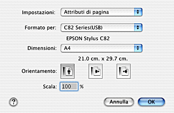 Nella finestra di dialogo Formato di Stampa, è possibile modificare il formato della carta, specificare l'orientamento della carta e ridurre o ingrandire la stampa.