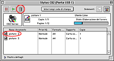 Nell'elenco Nome Documento, selezionare il documento in fase di stampa, quindi fare clic sul pulsante ad icona Elimina per annullare il lavoro di stampa.
