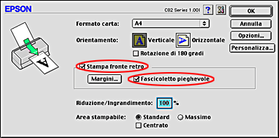 La EPSON Stylus C82 Series supporta la stampa fronte-retro. Sono disponibili due tipi di stampa fronte-retro. La stampa fronte-retro standard consente di stampare prima le pagine dispari. Una volta stampate, tali pagine possono essere nuovamente caricate per stampare le pagine pari sul lato opposto del foglio. La stampa fronte-retro sotto forma di fascicoletto pieghevole consente di ottenere dei fascicoletti con singola piegatura. Fare riferimento alla sezione appropriata riportata di seguito.