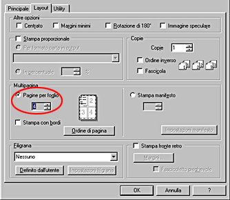 ![]() | In Windows, selezionare Pagine per foglio come impostazione di Multipagina nel menu Layout, quindi fare clic sulla freccia rivolta verso l'alto o verso il basso per selezionare un numero compreso tra 2 e 4. |