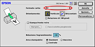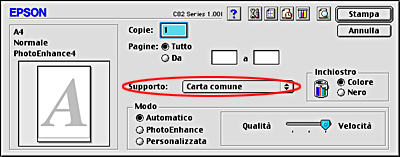 Nella finestra di dialogo Stampa (Macintosh), selezionare il Supporto desiderato; quindi, selezionare l'impostazione del formato carta desiderato nella finestra di dialogo Formato di Stampa.