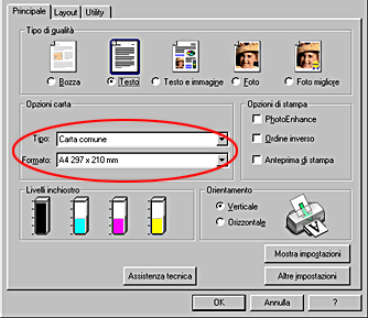 Nel menu Principale (Windows), selezionare il Formato ed il Tipo desiderato in Opzioni carta.