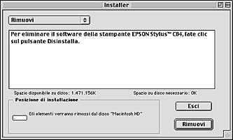 Fare doppio clic sull'icona Installazione applicazioni e selezionare Software per stampante EPSON dall'elenco. Quindi, fare clic su Aggiungi/Rimuovi (o Cambia/Rimuovi in Windows XP e 2000).