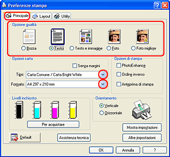 Fare clic sulla scheda Principale, quindi effettuare l'impostazione di Opzioni di qualità. Per informazioni dettagliate sulle impostazioni di Opzioni di qualità, vedere la sezione che segue. Vedere Opzioni di qualità