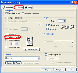 ![]() | Nella finestra di dialogo Layout, selezionare la casella di controllo denominata Multipagina, quindi selezionare Pagine per foglio. |