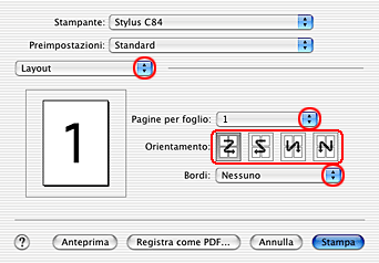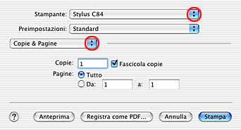 ![]() | Selezionare Stylus C84 come impostazione di Stampante, quindi effettuare le impostazioni di Copie & Pagine. |