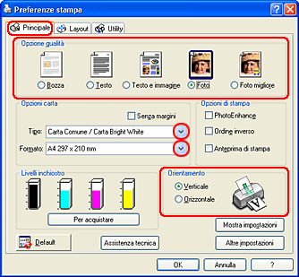 Fare clic sulla scheda Principale, quindi effettuare l'impostazione di Opzioni di qualità. Per informazioni dettagliate sulle impostazioni di Opzioni di qualità, vedere la sezione che segue.