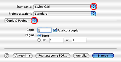 Far coincidere l'impostazione di Stampante con l'impostazione di Formato per effettuata nella finestra di dialogo Formato di Stampa al passaggio 3. Quindi, effettuare le impostazioni di Copie & Pagine.