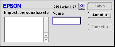 Digitare un nome univoco per le impostazioni nella casella di testo Nome, quindi fare clic su Salva. Il nome può contenere un numero massimo di 16 lettere e numeri. È inoltre possibile utilizzare fino a 8 caratteri a doppio byte; tuttavia, a seconda del sistema operativo in uso, tali caratteri potrebbero non venire visualizzati in modo corretto. L'impostazione personalizzata effettuata verrà aggiunta all'elenco Impostazioni personalizzate e verrà selezionata l'ultima impostazione. È possibile salvare fino a 100 impostazioni personalizzate.