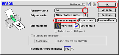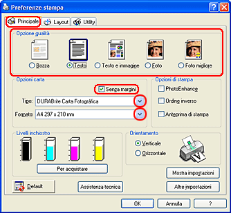 Dopo aver caricato il supporto, modificare le impostazioni del driver della stampante selezionando la stampa senza margini.