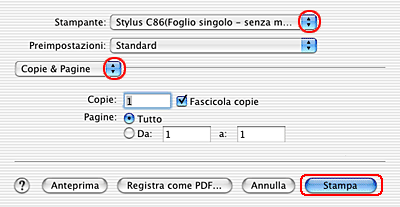 Selezionare Stylus C86 (Sheet Feeder - Borderless) come impostazione di Stampante, quindi effettuare le impostazioni di Copie & Pagine.