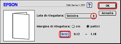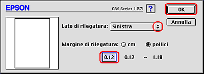 Specificare la larghezza del margine di rilegatura nella casella di testo. È possibile immettere larghezze comprese tra 0,3 cm e 3 cm oppure tra 0,12 pollici e 1,18 pollici.