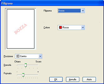 Accertarsi di aver selezionato la filigrana appropriata nella casella di riepilogo Filigrana, quindi definire le impostazioni relative a Colore, Posizione, Densità, Formato, Font, Stile font e Angolo. Per informazioni dettagliate, consultare la Guida in linea. Le impostazioni definite vengono mostrate nel riquadro a sinistra della finestra di dialogo.