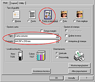![]() | Fare clic sulla scheda Principale, quindi selezionare Carta comune e A4 come impostazione di Opzioni carta e Testo e immagine come impostazione di Tipo di qualità. |