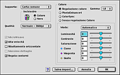 Se si seleziona Personalizzata come opzione di Modo, verrà abilitato l'elenco Impost. personalizzate, dal quale è possibile scegliere un'impostazione già predisposta studiata per la stampa di testo e grafici. Oppure, è possibile selezionare ColorSync, un metodo di corrispondenza dei colori. È possibile inoltre creare e salvare proprie Impost. personalizzate. Per informazioni dettagliate sulla creazione di impostazioni personalizzate, consultare Definizione delle altre impostazioni.
