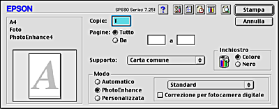 Quando si seleziona un'impostazione personalizzata, vengono regolate automaticamente altre impostazioni come Qualità di stampa, Mezzetinte e Colore. Le modifiche a queste impostazioni vengono mostrate nel riquadro a sinistra della finestra di dialogo Stampa.